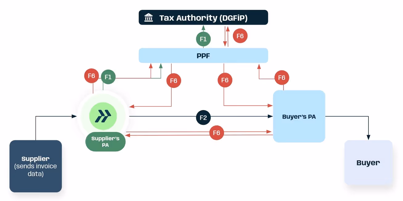The French e-invoicing flow refers to the structured transmission process used to exchange electronic invoices between accredited platforms and report regulatory data to the tax administration through the Public Invoice Portal (PPF).