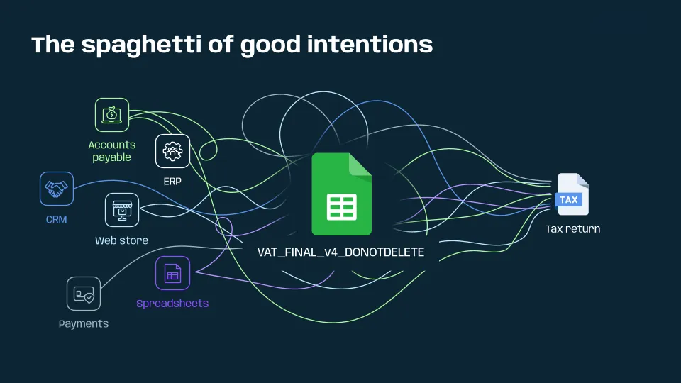 The diagram tells the story better than any description. Data flows in from CRM, ERP, accounts payable, web store, payments, and spreadsheets, tangling together into a single Google Sheet, one that has probably been renamed four times and carries the filename nobody is allowed to touch. That file produces the tax return. Every connection in that diagram made sense when it was built. Collectively, they have created something fragile, unscalable, and genuinely difficult to audit.
