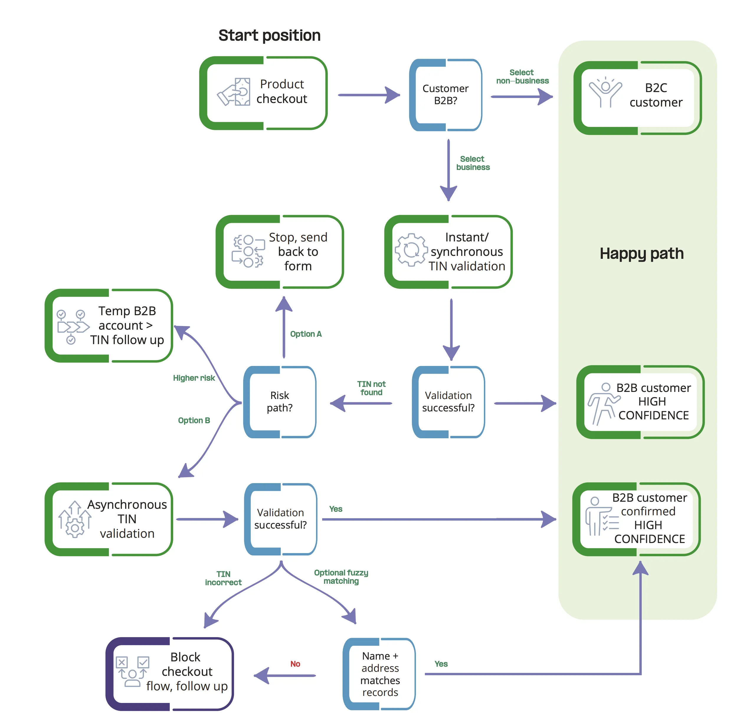 The "happy path" (shown in green) is where you want most transactions to land: validated B2B customer, high confidence, clean data flowing into your invoicing system.