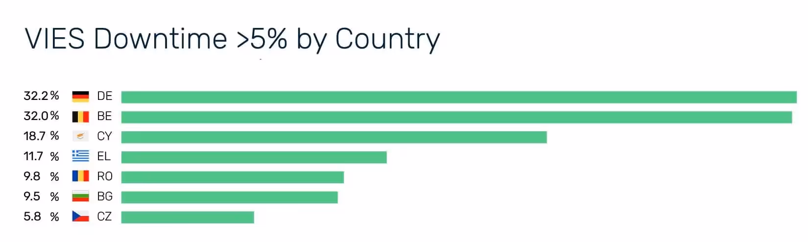 For instance, over a particularly bad three-day period in January 2023, Fonoa calculated that VIES was unable to provide a TIN validation service for Belgium (~32% of the time), Germany (~32%), and Romania and Bulgaria (~9.8% and ~9.5%, respectively). There were seven EU countries with downtimes above 5% during this short span.